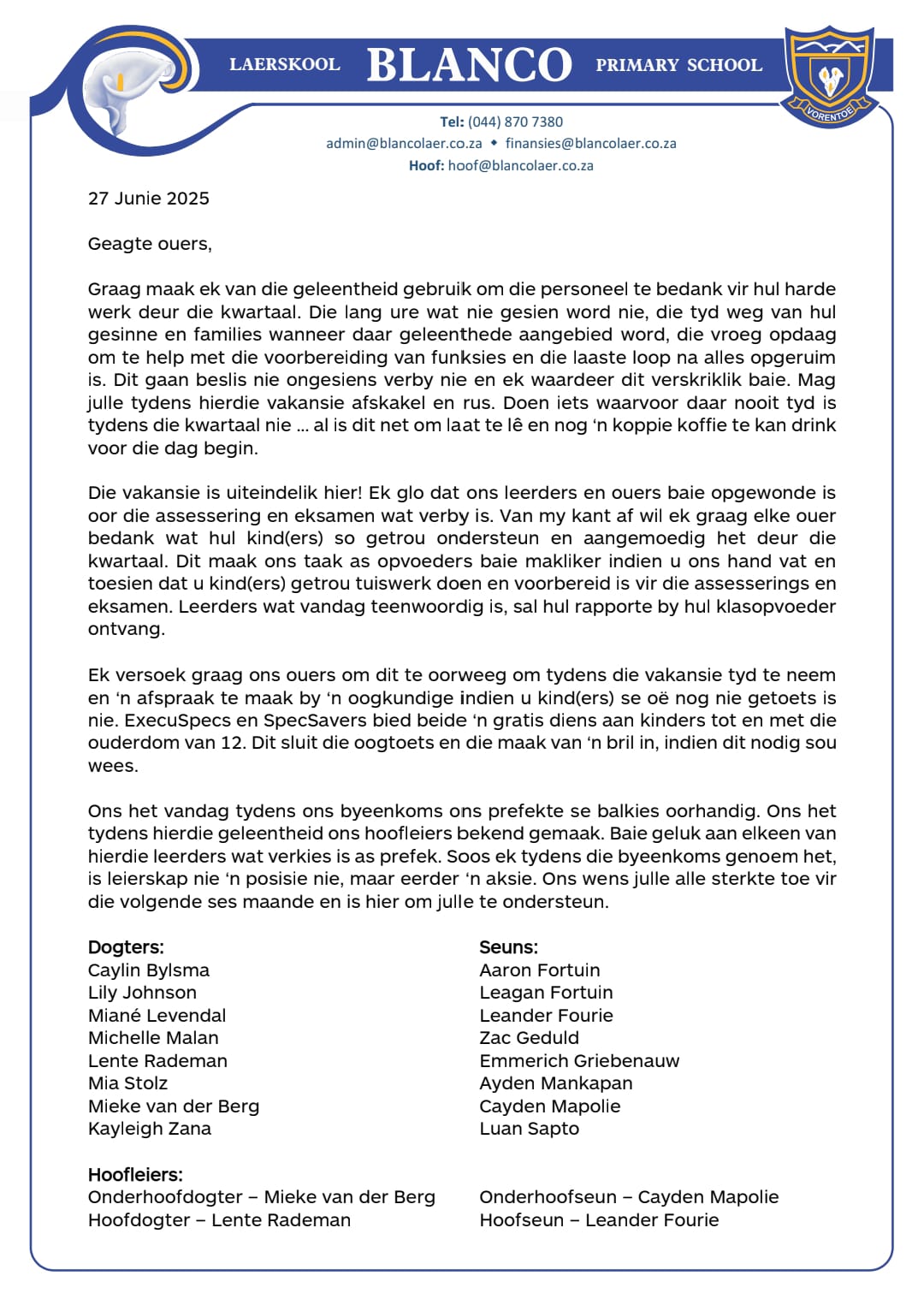 blanco27 June, 2025Skoolbrief Brief uit die Hoof se kantoor: 27 Junie 2025 Related ArticlesBRIEF UIT DIE HOOF SE KANTOOR: 21 APRIL 2026BRIEF UIT DIE HOOF SE KANTOOR: 23 Maart 2026BRIEF UIT DIE HOOF SE KANTOOR: 11 Maart 2026