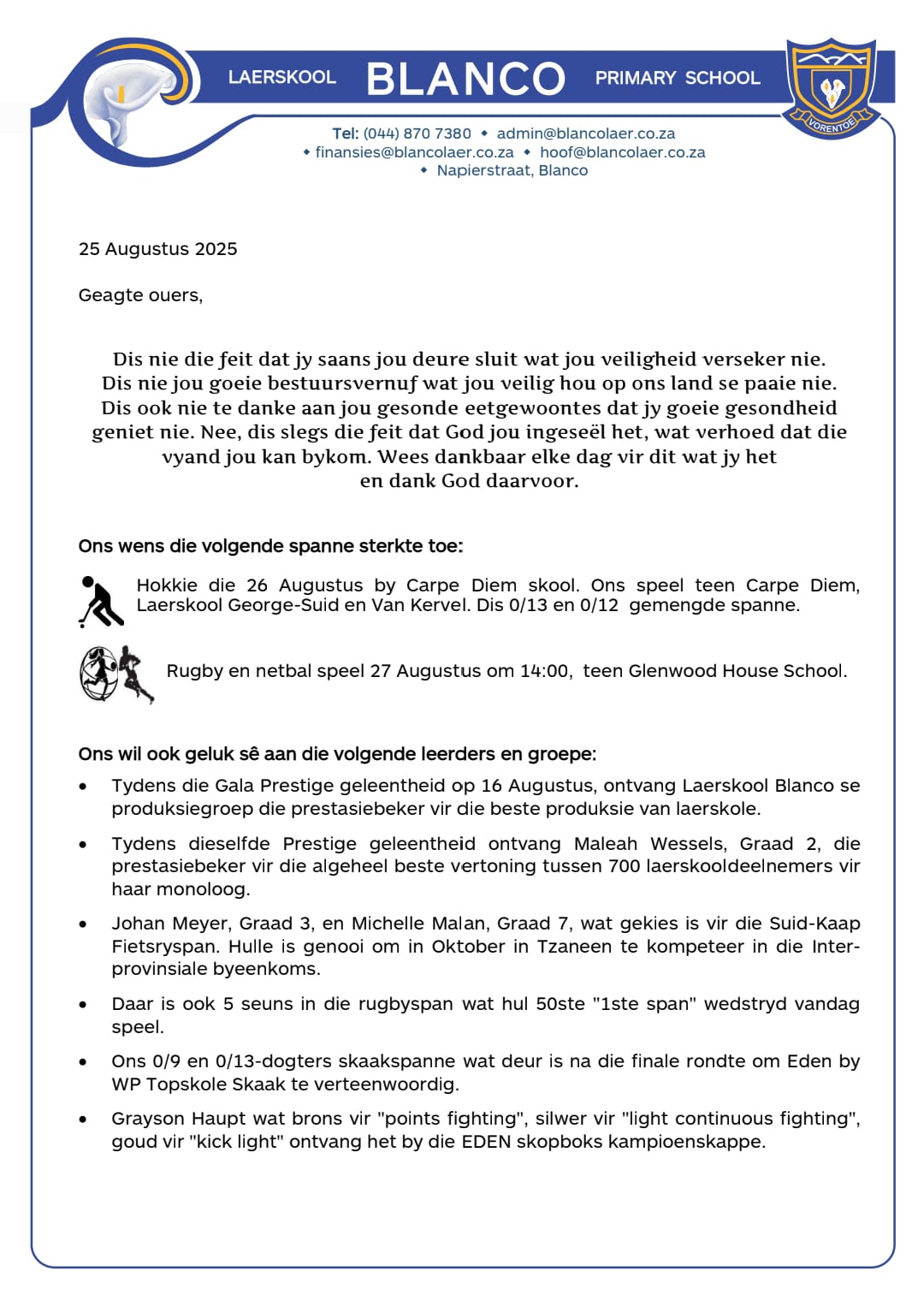 blanco22 August, 2025Skoolbrief Brief uit die Hoof se kantoor: 22 Augustus 2025 Related ArticlesBRIEF UIT DIE HOOF SE KANTOOR: 21 APRIL 2026BRIEF UIT DIE HOOF SE KANTOOR: 23 Maart 2026BRIEF UIT DIE HOOF SE KANTOOR: 11 Maart 2026